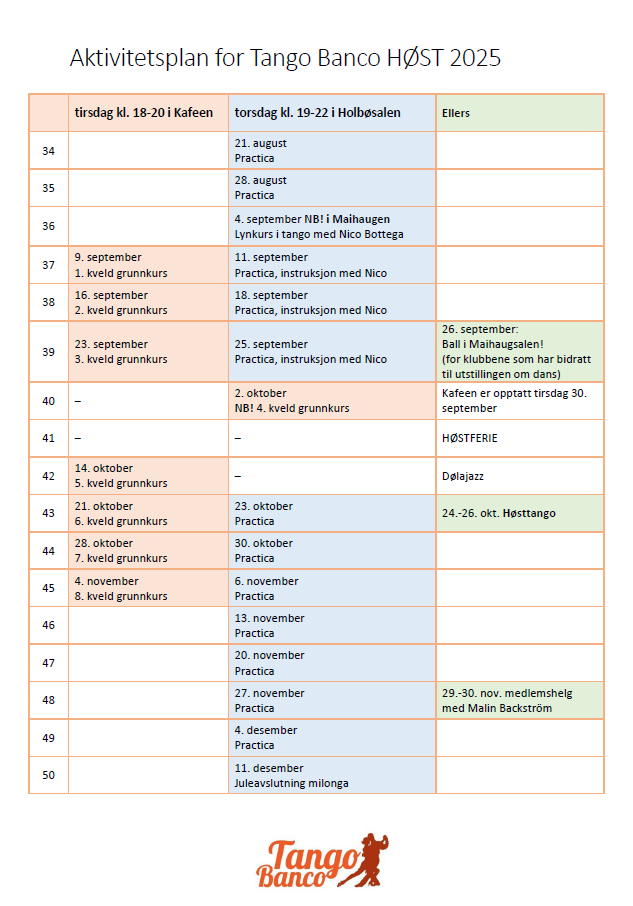 Torsdag er fast tangodag på Lillehammer - velkommen! Det er bare å møte opp 🙂 NB! Benytt inngangen på baksiden av bygget. Vi starter med 1-1,5 time instruksjon, deretter spiller vi musikk og øver & danser. Pris: kr 60/100 for medlem/ikke-medlem (med gjesteinstruktører: kr 150/200) Ønsker du mer info sjekk hjemmeside: http://tangobanco.org/ følg gruppa Tango Banco på Facebook kontakt styret: tangobanco@gmail.com